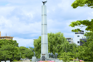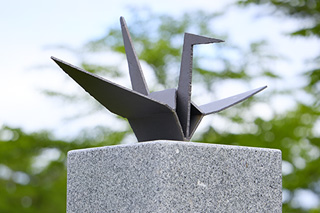 アメリカ同時多発テロ被害者の遺族団体『9.11家族会』から、東日本大震災の復興を願って寄贈された『復興の折り鶴』。開成山公園に設置されたこのモニュメントには、テロで崩壊したニューヨークの世界貿易センタービルの鉄骨が使われている。