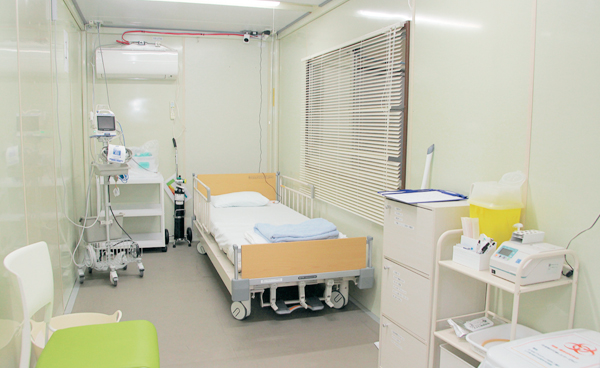 本院から約10kmの距離に位置する『ゆいの杜記念病院』は、COVID-19患者専用の入院施設。簡易的ながらシャワーやトイレもある24床分の病室を備えている。病室内のウイルス量を低下させ2次感染リスクを下げるために、HEPAフィルターと陰圧装置も付属させた。
